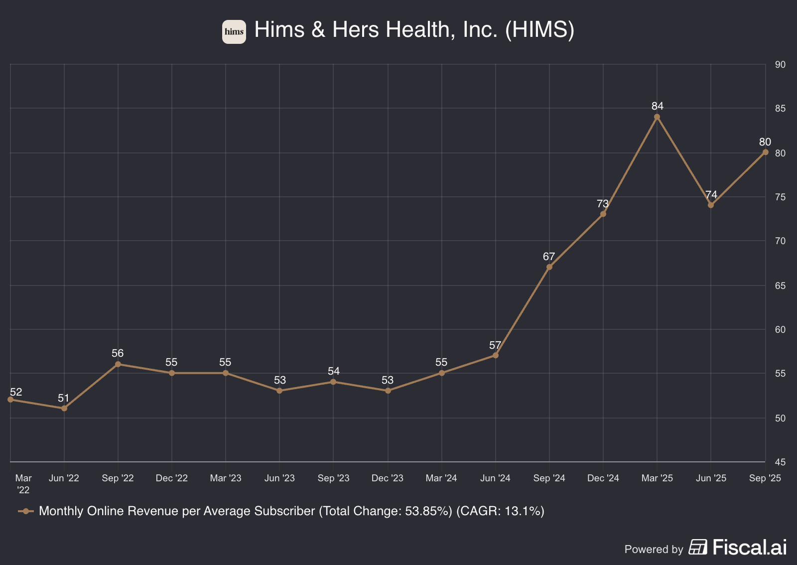 A aritmética é simples mas poderosa: com 2,5 milhões de subscritores a $80/mês, a base de receita recorrente anualizada aproxima-se dos $2,4 mil milhões, apenas com os clientes que a empresa já tem, sem crescimento adicional. É esta visibilidade de receita que distingue a Hims de praticamente todos os seus pares no sector.